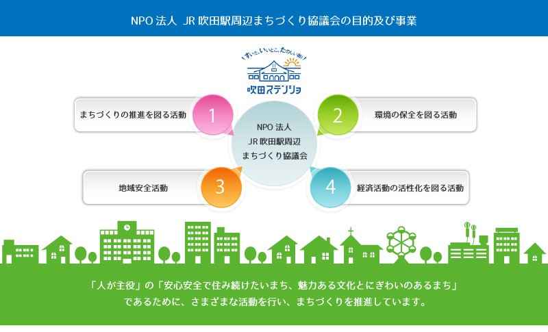 JR吹田駅周辺地域において多様な都市機能がコンパクトに集積した都市拠点にふさわしい市街地環境の整備、活性化を図り、この地域が将来にわたって「人が主役」の「安心安全で住み続けたいまち、魅力ある文化とにぎわいのあるまち」であるために、市民、事業者等および行政が課題を共有し、協働して、事業、調査研究、啓発、提言並びに各種支援活動を行い、まちづくりを推進することを目的とし地元商店街や企業、地域団体の代表者により、平成23年9月13日設立されました。